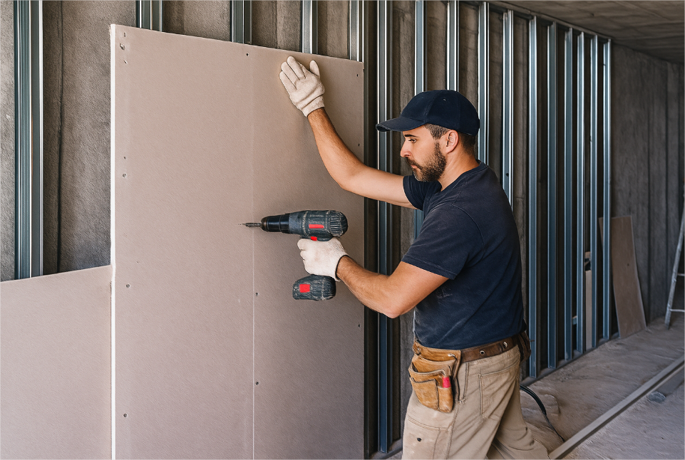 - Colocación de placas: atornilla las láminas al armazón metálico.
